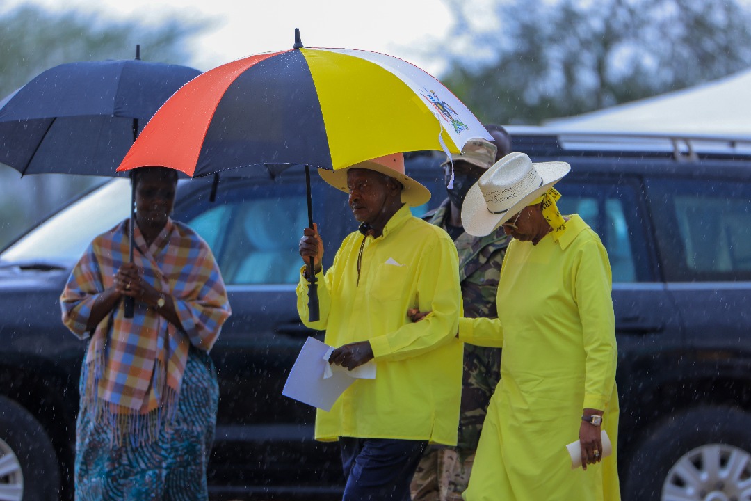 Museveni, accompanied by the First Lady, Janet Museveni arrived a few minutes after mid-day and was welcomed by a heavy downpour, a few minutes before he could ascend to the podium to address the gathering.
