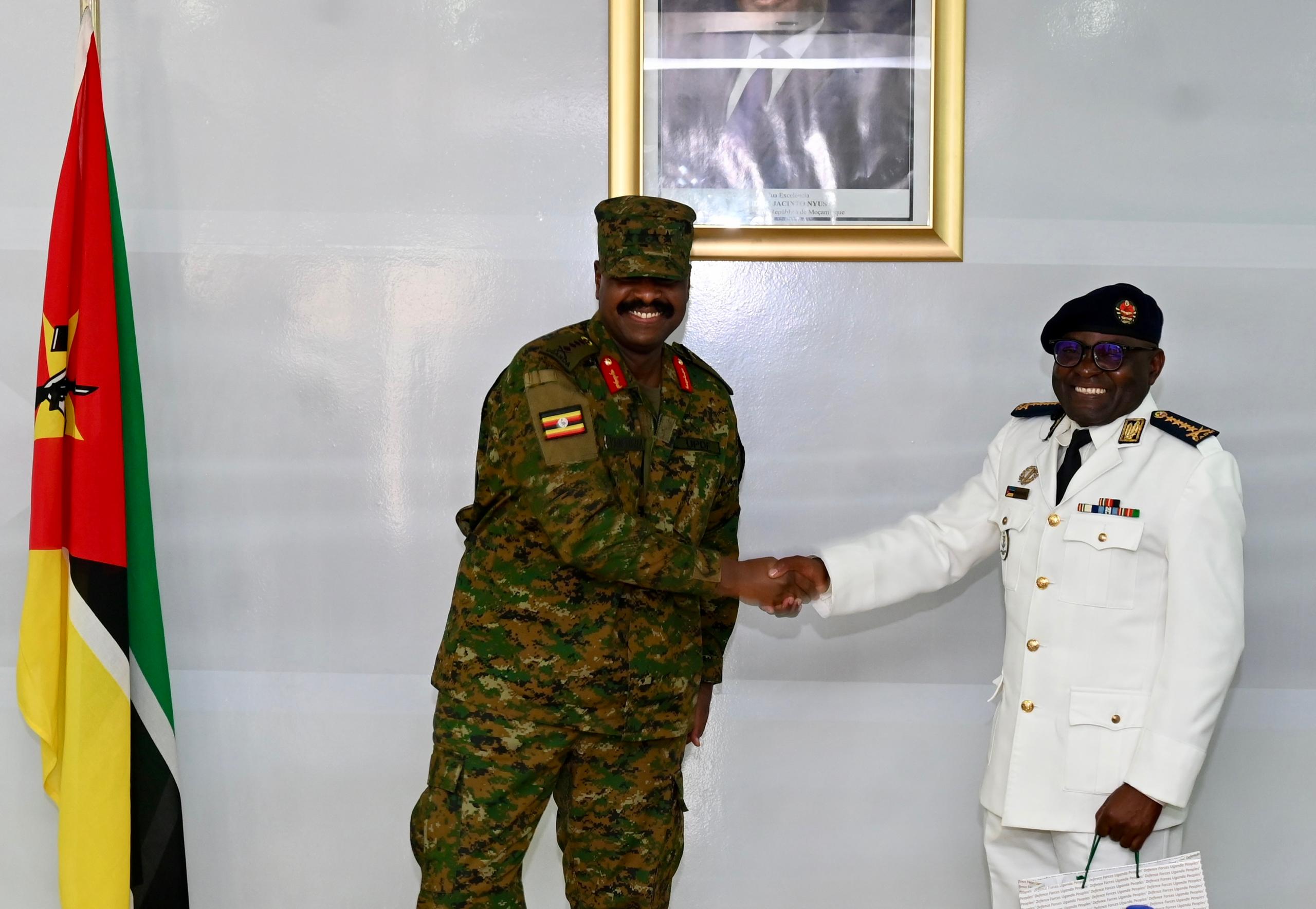 The Chief of Defence Forces of the Uganda People’s Defence Forces (UPDF), Gen Muhoozi Kainerugaba, has met with his Mozambican counterpart, Admiral Joaquim Mangrasse, the Chief of General Staff of the Mozambique Armed Forces (FADM), in Maputo.